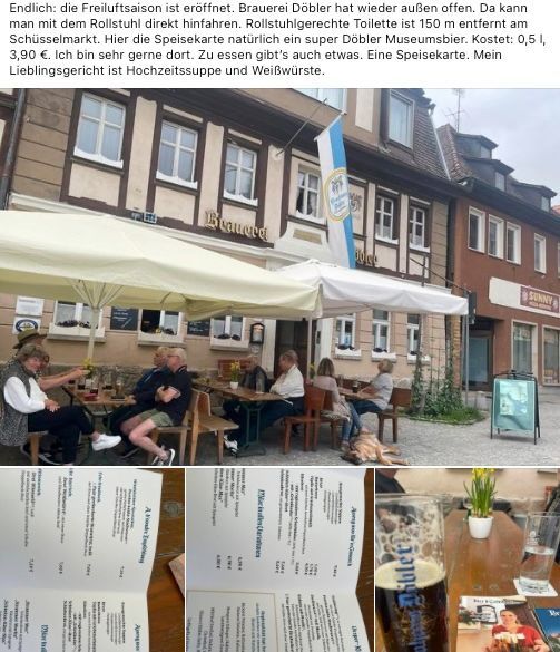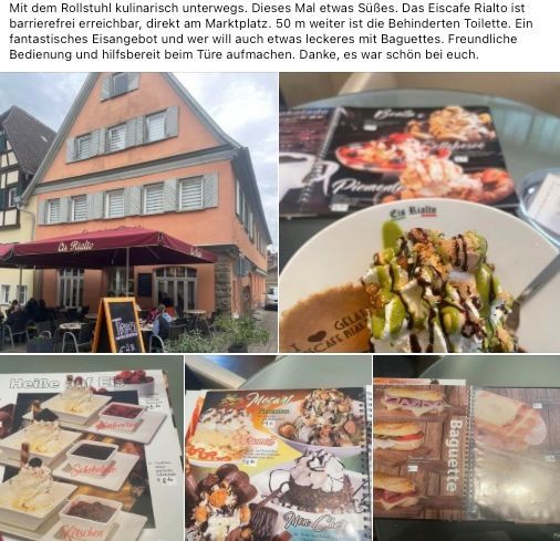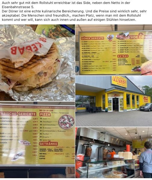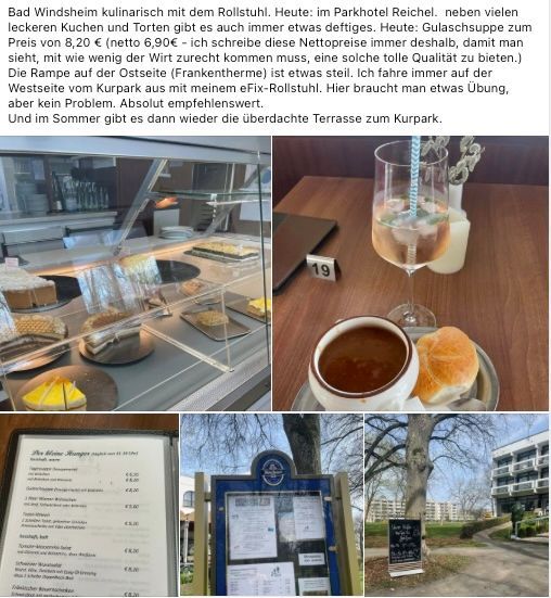 Auf dieser Seite folgen kurze Erfahrungsberichte mit dem Hinweis, ob und wie es mit dem Rollstuhl möglich ist, diese Gastwirtschaft etc. aufzusuchen.