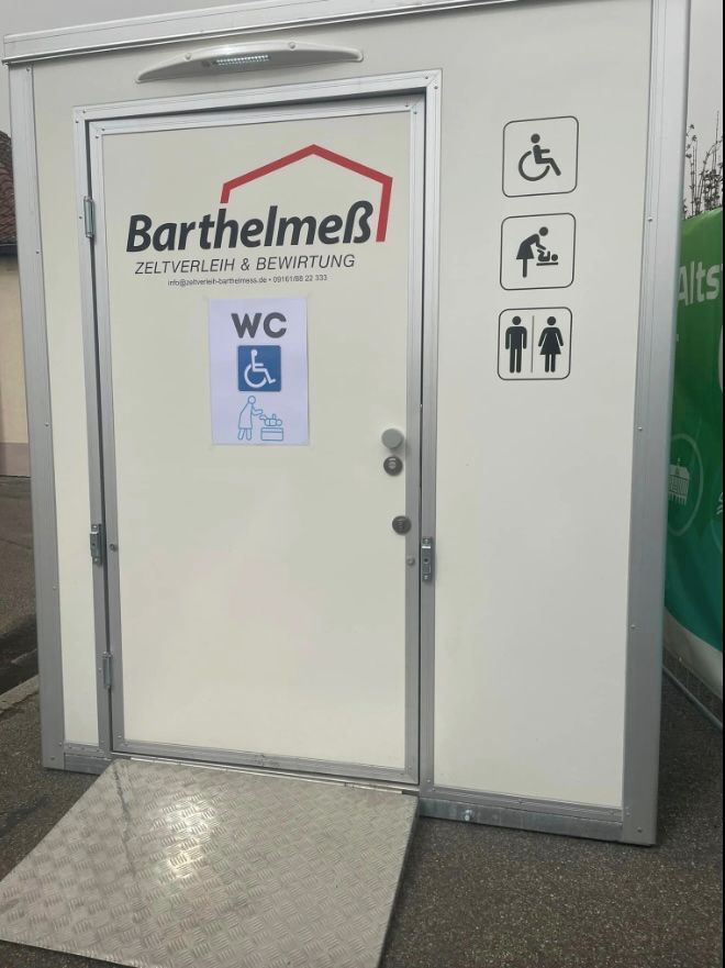 Eine rollstuhlgerechte Toilette ist in der benachbarten Franken-Therme, bzw. im KKC.