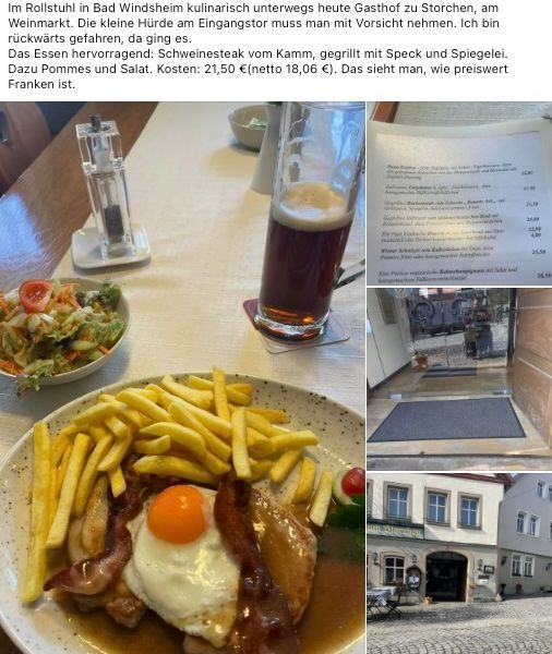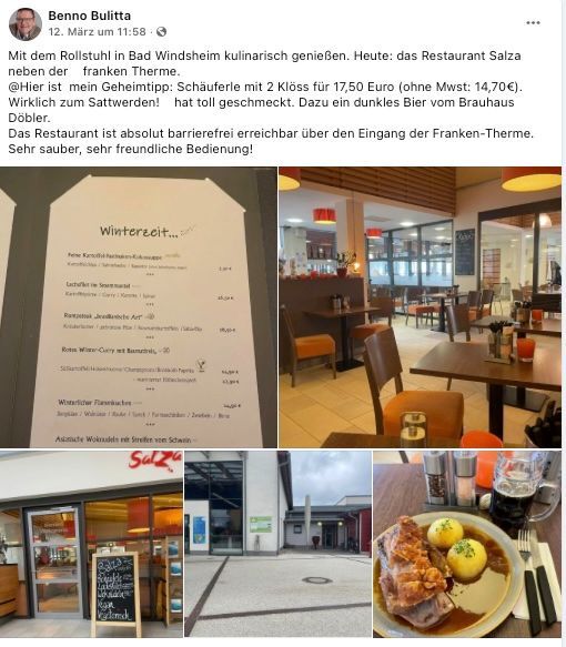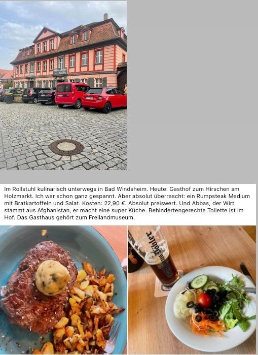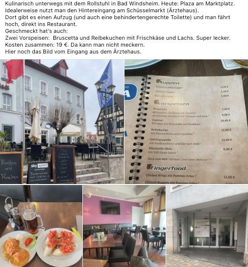 Es ist wirklich lobenswert, wie attraktiv unsere Stadt Bad Windsheim auch für Menschen mit Mobilitäts-Einschränkungen ist, und welches wirklich abwechslungsreiches kulinarisches Angebot die Gäste in Bad Windsheim erwartet. Deshalb stelle ich meist mein Lieblings-Gericht als Tipp für Sie vor.
