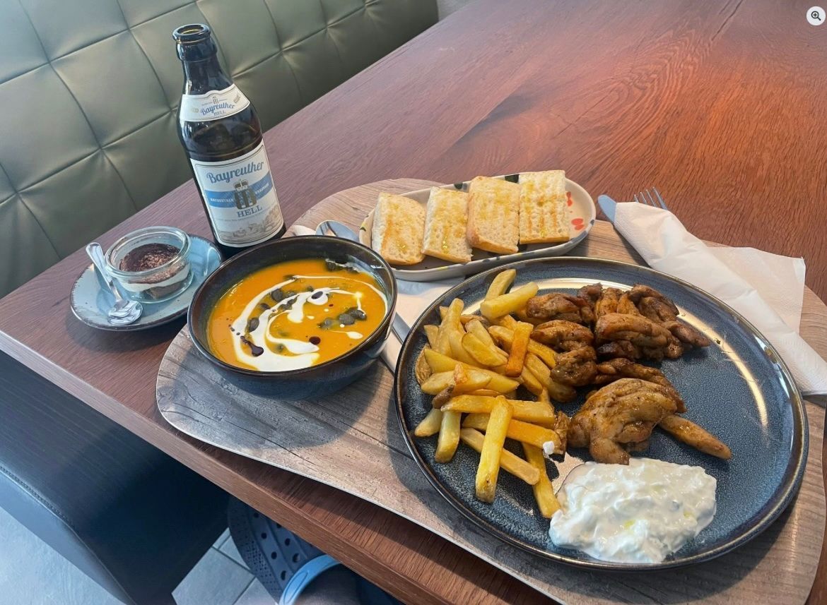 INCANTO - ein guter Tipp für ein barrierefreies Restaurant in der Altstadt von Bad Windsheim. Wie der Name schon sagt: Charmant. 3 Gänge: Kürbissuppe, Hähnchen-Gyros und ein kleiner Nachtisch. Inkl. ein 0,33 l Bier: 17,50 €.