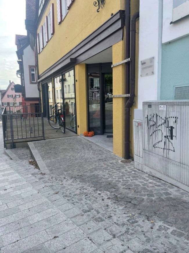 Rollstuhl-Zugang über eine kurze Rampe mit elektrischer Türöffnung. Ein rollstuhlgerechtes WC ist nicht vorhanden. Wenn es geht, empfiehlt es sich, den Aufzug im Neubau zu nutzen (dieser ist etwas breiter als im Altbau). Vor dem WC im 1. OG kann man den Rollstuhl ‚parken‘, muss dann aber 3 - 4 Schritte laufen können .